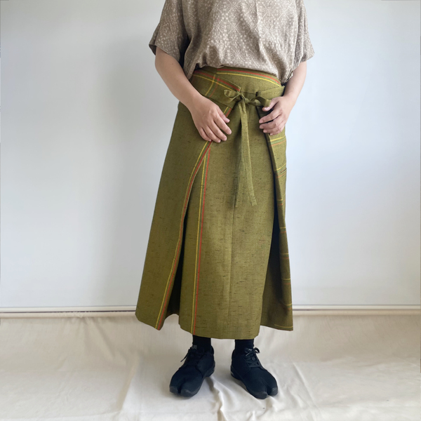 【1点もの】四角布のスカート -シルクウール着物地 黄土色に赤、橙、黄のライン