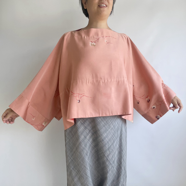【1点もの】丁字のプルオーバー2way -絹 着物地 桃色に花