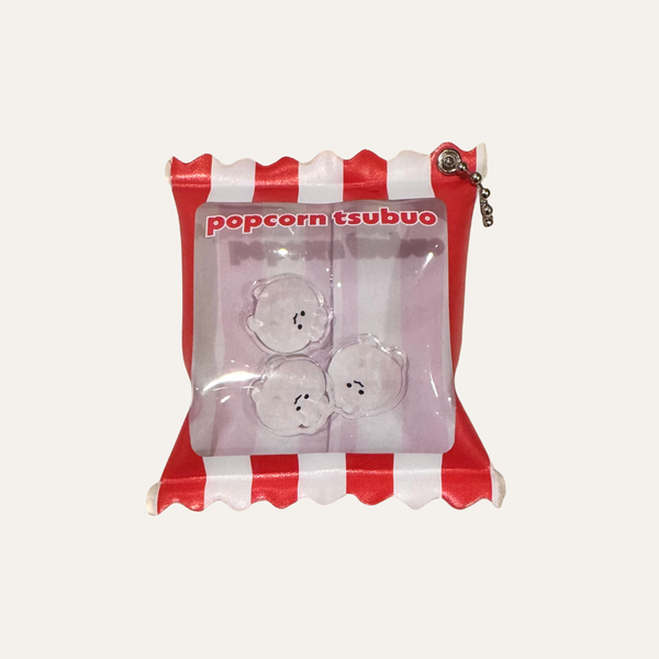 ぎゅうぎゅうに詰められたポップコーンから逃げ出してきた、「ポップコーンのつぶお」のオリジナルのグッズの販売(ぬいぐるみ、ステッカーなど)。