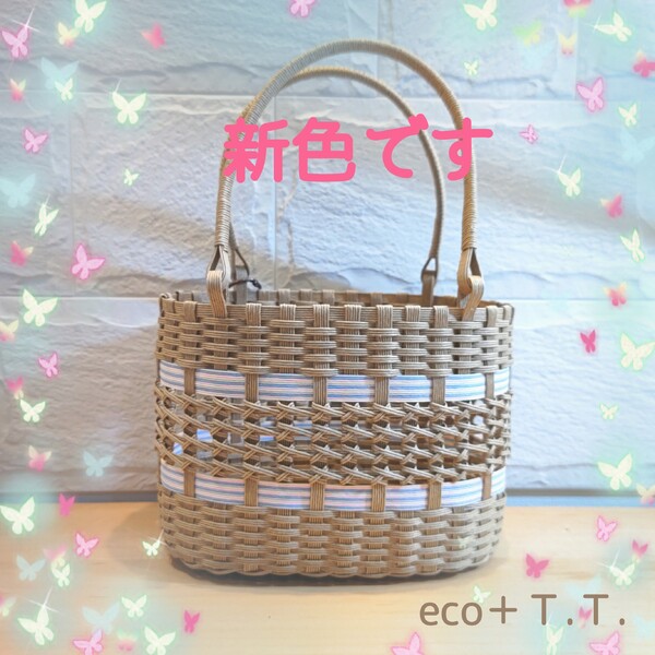 クラフトバンドで編んだカバンにお好きな巾着を選んで、自分好みのカバンをすることができます。