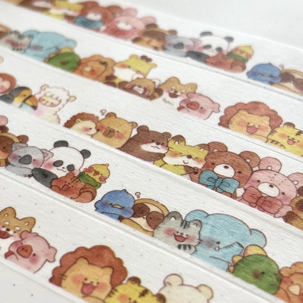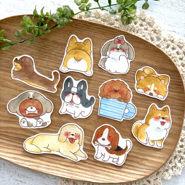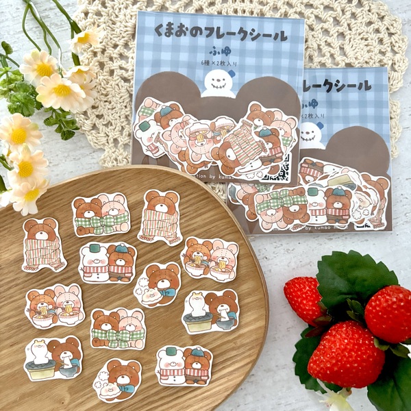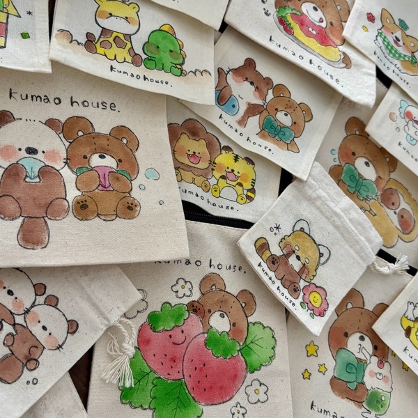 ステッカーやマステ、フレークシールなどの紙雑貨やキーホルダー、手描き巾着など。